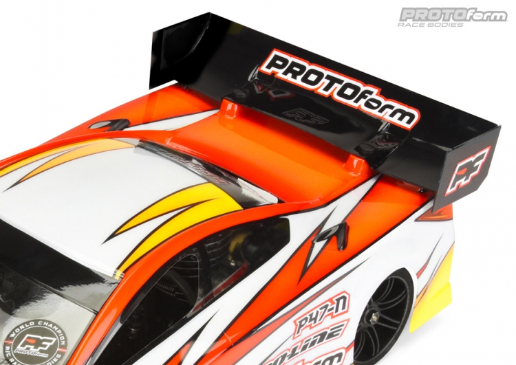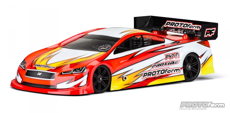 Presenting the latest in aero performance and styling for 1:10 Nitro from PROTOform: P47-N.The P47 is the next evolution of the IFMAR World Title-winning P37. Featuring all-new aero concepts and some design cues never before seen in the class, the P47 was exhaustively tested by our team to find a body that offers more precise and smooth steering, increased corner speed and forward bite, and additional top speed on long straights. A raised section of the left side window can be cut out to scoop air into the body for additional engine cooling, and a large high-downforce/low-drag wing complete the design.