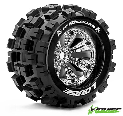 This is a pair of truck tires mounted on chromed nylon 3.8" wheels with 0" off-set (with Traxxas@ Style 3.8" Bead). The MT-MCROSS tires can take you anywhere and feature an MX style tread pattern that is perfect for back-yard racing on any rough surfaces and conditions.The MT-MCROSS is perfect for your 1/10-1/8 Monster Truck such as Traxxas E-Maxx, E-Revo & Revo or Arrma Talion & Nero.