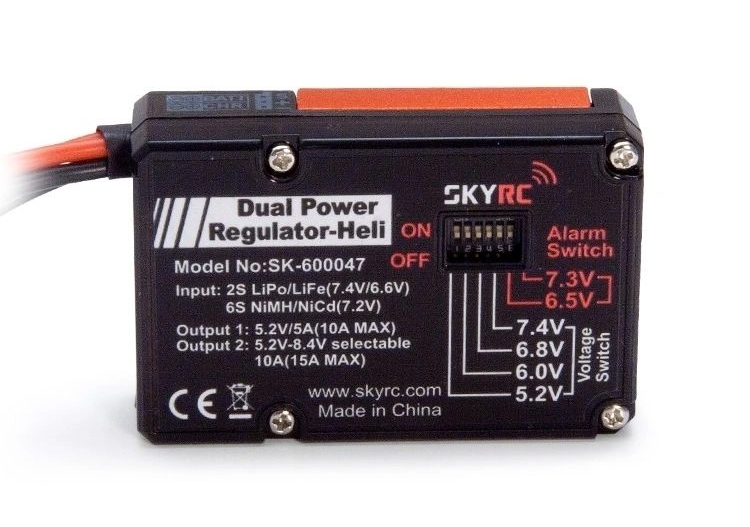 - And according to the traditional way, two same regulators will be packed in one case and the performance of the electronics, like servo, ESC, gyro can not be fully performed . To improve this, we use twin output design one is for CCPM servo and the other is for RX and gyro. The circuit of servo controls the power and responsibility while the circuit of RX and gyro controls the voltage stability and noise-free. You have five choices of the output voltage 5.2V, 6.0V, 6.8V, 7.4V, 8.4V(Bypass) which can be set up by DIP switch. As this parameter is stored in it, and extra voltage measurement is not needed.