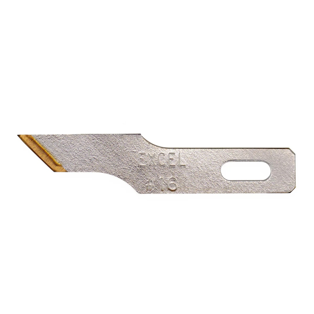 Excel Blades #16 är ett stencilblad med rak egg, utvecklat för arbete där precision och kontroll är avgörande. Bladet är dubbelslipat och belagt med Titanium Nitride (TiN), vilket minskar friktion och slitage jämfört med obehandlade blad.