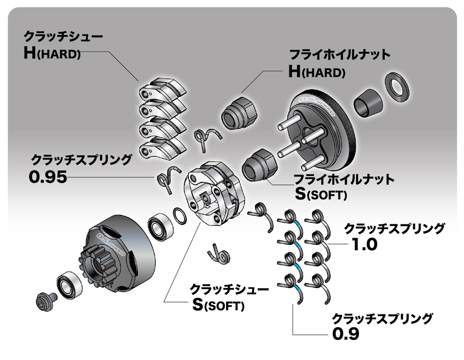 2. Changing from the standard "0.95" to "0.9" will allow the clutch to engage at low RPM, and changing to "1.0" will allow the clutch to engage at high RPM. We also recommend using two springs of different thicknesses, but be sure to install the same type of spring diagonally.