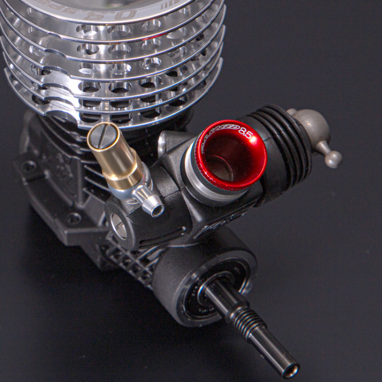To increase torque on high-grip track surfaces, a newly designed 9-port sleeve is adopted. O.S. SPEED's traditional DLC coated crankshaft delivers linear power from low to top by changing the counter balance. The outer head has been mirror finish and by clear coat from the conventional color to a silver head base has been adopted. By adopting a thrust plate made out of steel, wear due to interference between the connecting rod and the cover plate during rotation is reduced and engine life is improved.