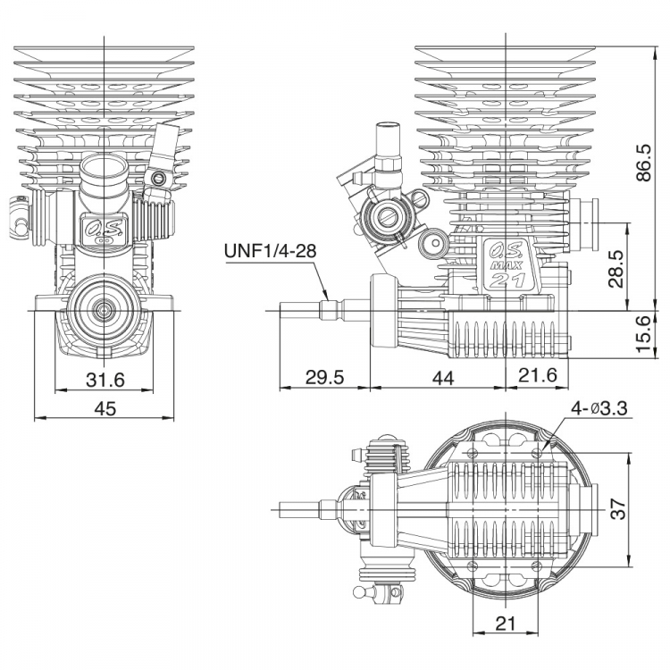 Popular 1 / 8GT touring category as a new category that can realize a dynamic race scene just like a real car. A new engine, O.S.SPEED R21GT, will be launched in anticipation of the IFMAR World Championship in the United States. Performance is improved over the entire area compared to the previous model O.S.SPEED 21XZ-GT. The crankcase is a refined version of the R2101, which has a proven track record in on-road racing. The cylinder / piston adopts 5 ports of scavenging and 3 ports of exhaust that have cleared IFMAR regulations. The newly-designed crankshaft is designed with DLC coating and counterweights, which inherited the tradition of O.S.SPEED, and press-fitted with emphasis on pit-up. A new outer head that emphasizes cooling performance was adopted in consideration of the GT touring race scene. The carburetor is equipped with a newly designed double adjust type 22E (B) GT cab that emphasizes pickup performance that smoothly follows the rise from the corner where GT touring is important. The reducer is also equipped with φ7 in accordance with IFMAR regulations.Specs: