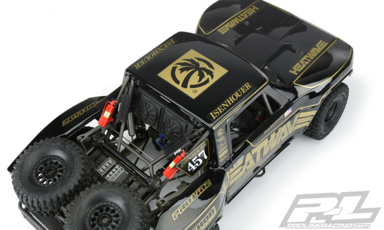 This is the 1967 Ford® F-100 Race Truck Heatwave® Edition Tough-Color (Black) Body for the Unlimited Desert Racer®. Now you can build a fully licensed replica of the popular full-size Heatwave® Trophy Truck driven by Chris Isenhouer! Chris races his iconic Black and Gold Heatwave® Ford® F-100 converted to Trophy Truck specs in the unrelenting desert along with his brother Nick. Pro-Line is proud to bring Chris’ truck to life for your Traxxas® UDR® made from Pre-Cut Tough-Color Black Polycarbonate. The massive Black and Gold Heatwave® decal wrap is also included and pre-cut for easy installation. The body features the iconic flat front F-100 grill and wide fender flares to represent the aggressive fiberglass bulges found on Chris's full-size race truck. Pro-Line's 1967 F-100 Heatwave® Edition body mounts directly to the cage on the UDR® in the same locations as the stock body, so all you need to do is remove the outer film, place the wrap following the included instructions, and install the body just like you would the stock body. Transform the look of your Unlimited Desert Racer® and add even more scale realism with the fully licensed 1967 Ford® F-100 Race Truck Heatwave® Edition Body from Pro-Line!Features: