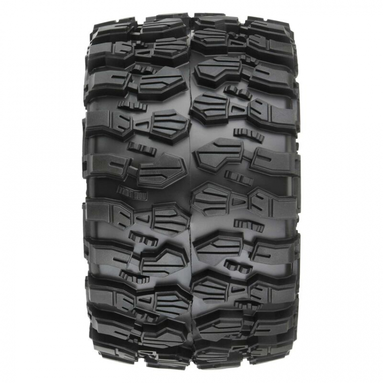 Pro-Line is very excited to announce the all-new Hyrax 2.8" tire pre-mounted to the Raid Black 6x30 Removable Hex wheel! We take the guesswork out of your glue job by doing the mounting for you so you can spend more time having fun!Pro-Line is bringing the extremely popular Hyrax rock crawling tread to the 1:10 Monster Truck scene with the Hyrax 2.8" tire! Whether it is loose or hard-packed dirt, sand, snow, street, or gravel, the Hyrax 2.8" tire is up to the task. The Hyrax 2.8" tire was designed to have ultimate traction combined with long-lasting durability. Each tire lug is shaped to dig into whatever surface you are running on and is ultra-thick so that it is extremely durable.