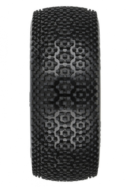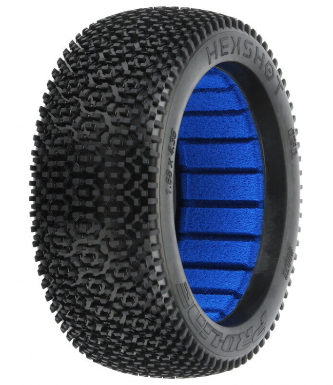 This is a pair of Hex Shot 1/8 Buggy Tires. Introducing the Hex Shot 1/8 Buggy race tire, a stepped-pin tire designed to tackle loose and loamy tracks. Beefy pins are arranged in rows of hexagon-shaped pods down the center of the tire, while the smaller outer tread is made up of connected chains of pins. The step-pin design helps support the tall pins while your buggy carves through loose dirt, providing excellent forward grip and braking stability.The Hex Shot is made with Pro-Line's latest generation carcass shape for improved bump handling, while the large pin design gives you the longevity for main events. Don't get caught spinning your tires in the dirt, be the first at your track to win with Pro-Line's Hex Shot!