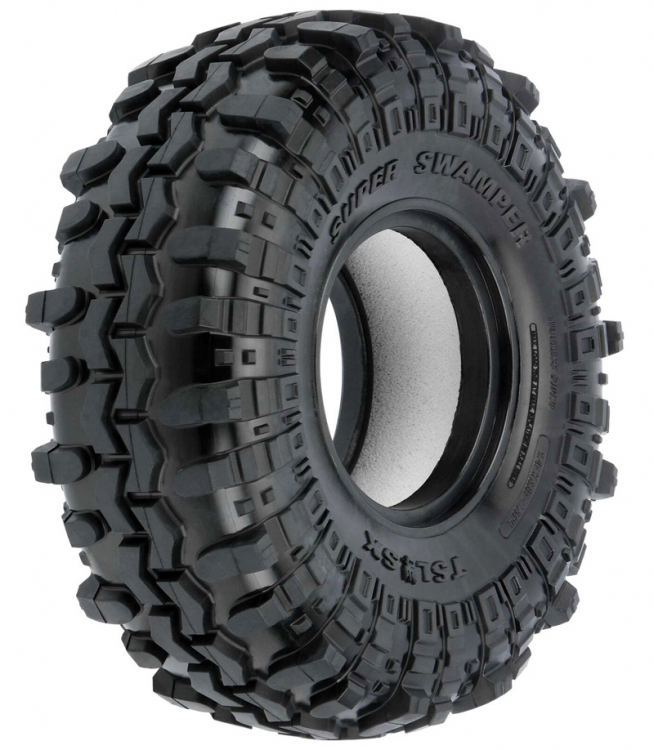 This is a pair of Interco® Super Swamper® TSL SX 1.55" Crawler Tires. Under official license from Interco® Tire Corporation, Pro-Line is proud to announce our first ever tire for 1.55" size wheels: the legendary Super Swamper® TSL SX! With "almost scale" not being acceptable and access to Interco's® design data, Pro-Line's engineering staff has reproduced the original Super Swamper® in a scale configuration matched by none. The new 3.85" tall by 1.45" wide Class 0 tire is perfect for those ultra-scale 1.55" wheel rigs begging for matching scale tires combined with unmatched rock crawling performance.The full-size Super Swamper® TSL SX features the ultimate tire tread design by pairing the distinctive chevron tread pattern with the famous, trademarked, and patented Interco® TSL (three-stage lug) tread design. TSL is a lug pattern with short, intermediate, and long lugs that are each uniquely arranged, proportioned and spaced which allow them to bite quickly and self-clean rapidly. Each of these details has been faithfully recreated in Class 0 size to fit your 1.55" wheel. Just like the full-size Interco® Super Swamper® TSL SX tires, Pro-Line tires are proudly Made in the USA!