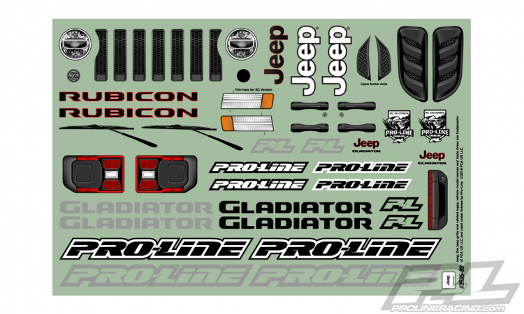 This is the Jeep® Gladiator Clear Body for SC and MT. Calling all Jeep® fans! Pro-Line is proud to release the all-new Jeep® Gladiator Rubicon body for your favorite Short Course and Monster Trucks! The Gladiator combines the iconic and unmistakable Jeep® body styling with the utility and ruggedness of a truck that tells everyone that you are ready for adventure. Pro-Line has included all the scale Jeep® Gladiator detail you would expect into the body and sticker sheet that will completely transform the look of your truck. The 1-piece Jeep® Gladiator body comes clear, so you can customize the look of your truck in any way you desire! This body is destined to become a must-have for your Short Course or Monster Truck. Get your Jeep® Gladiator body today!Features: