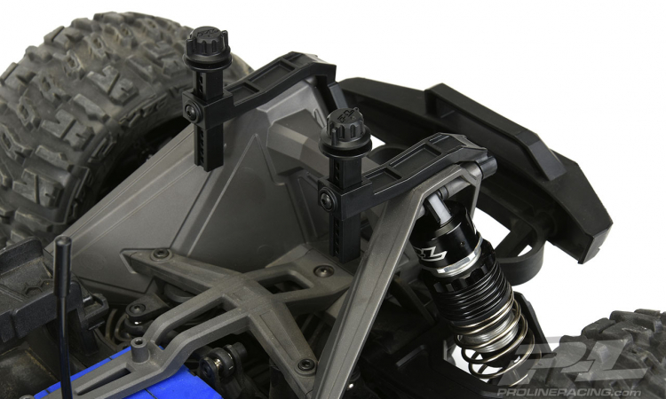 This is an Extended Body Mount Kit with Secure-Loc Caps for the MAXX®. Pro-Line continues to innovate with more must-have accessories for your truck. The all-new Pro-Line body mount kit includes adjustable body mounts so you can fit different bodies onto your MAXX®! But Pro-Line Engineers did not stop there. Instead of just using the stock body mounting system that always causes your body to pop off and go flying, the Pro-Line Extended Body Mount kit includes a revolutionary screw-on body mounting system for a strong and secure mount every time. No more doing the walk of shame to pick up your lost body! Just screw down the included setscrew into the body mount, place the O-Ring over the setscrew and mount your body as you normally would, but with the added safety, security, and styling of Pro-Line's innovative screw on body mounting system! This body mount system opens many new body options that you didn't have before.Check out the list of Pro-Line bodies below that will fit your MAXX® with these body mounts:
