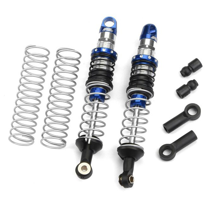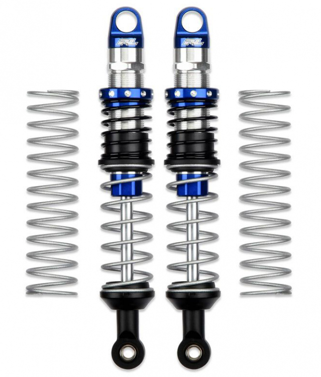 This is a pair of Pro-Spec Scaler Shocks. Pro-Line is proud to announce the next generation of RC Shock Technology with our all-new Pro-Spec Scaler Shocks! The new Shocks feature CNC machined Aluminum Shock Caps, Collars, Bodies, Bottom Caps and Hard Chrome Coated Steel Shock Shafts all made to exacting tolerances. X-Ring seals are used as the main shaft seal for smooth, low friction action and to prevent leaks. Just like Pro-Line's other Pro-Spec Shocks, the new Scalers are meant to stand out from the crowd with bright Chrome and Blue anodizing. From the top mounting hole to the bottom mounting hole these Pro-Spec Scaler Shocks measure out to be 90mm at full extended length and collapse down to about 64mm and they include extra 5mm longer Shock Ends to increase the shock length! These shocks are perfect for super scale rigs! Just like Pro-Line's extremely popular PowerStroke Shocks, the Pro-Spec Scaler Shocks come mostly pre-built (just add oil) and are designed to fit on many popular crawler vehicles. They also include Scale looking and performing Dual Rate Springs or optional Single Rate springs.Features: