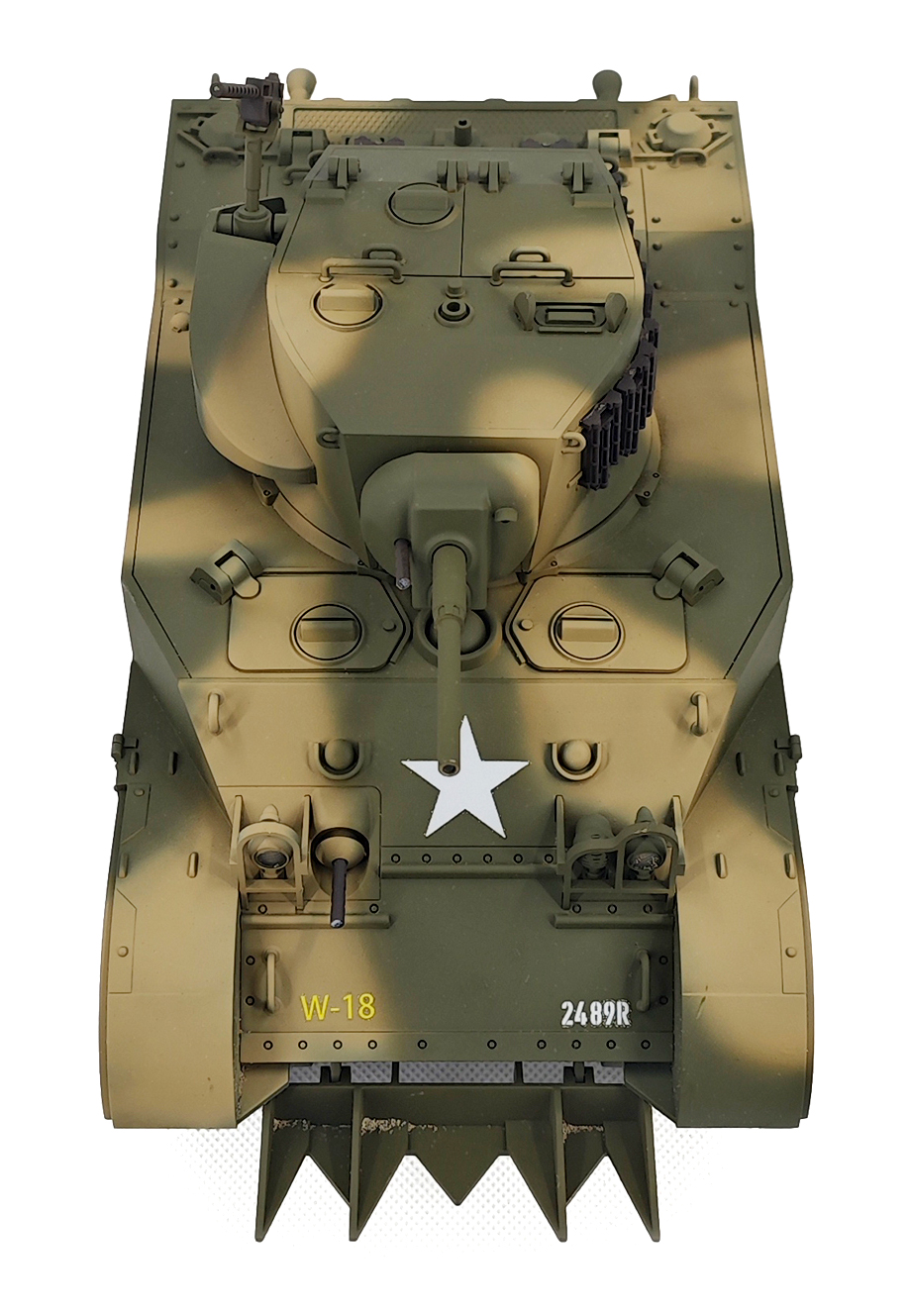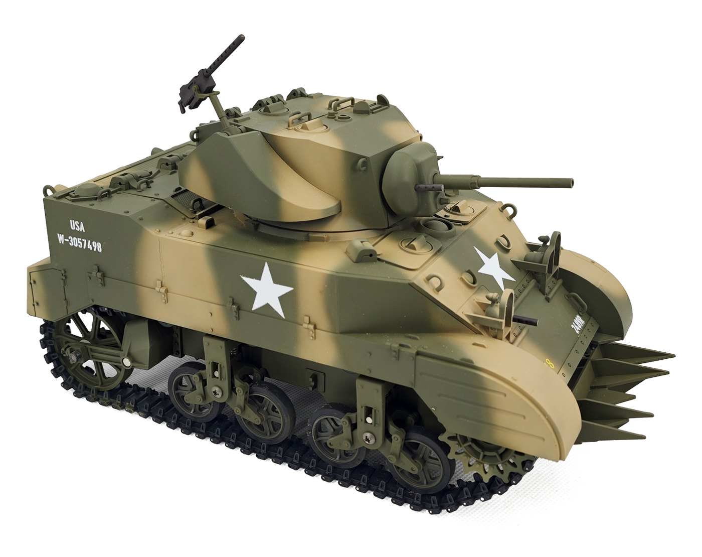 RC Model with A Lot of Detail - The remote control tank has the same suspension system as the M5A1 Stuart. All load-bearing wheels are independently suspended, which allows it to go through complex terrain easily. It also can make effects and engine sounds and has controllable lights. What's more, you can control it to release smoke while moving. Note: Smoke fluid needs to be purchased by yourself.