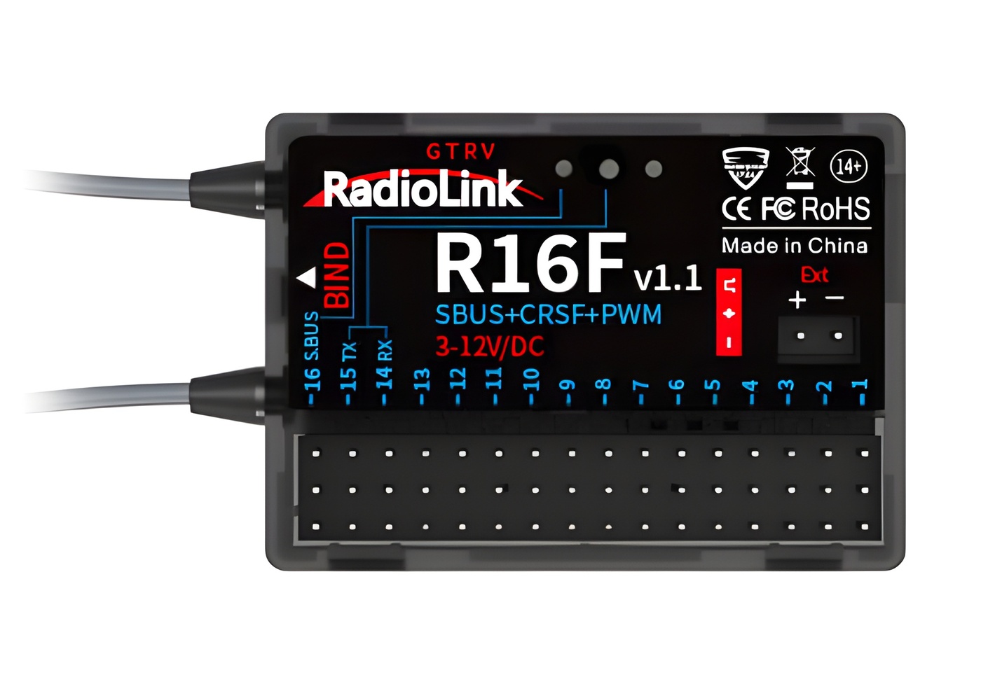R16F, with 16 channels output, is compatible with helicopters, fixed-wing, gliders, multi-rotors, engineering vehicles, racing boats, robots, lawnmowers, bait boats, and other model types on the market.