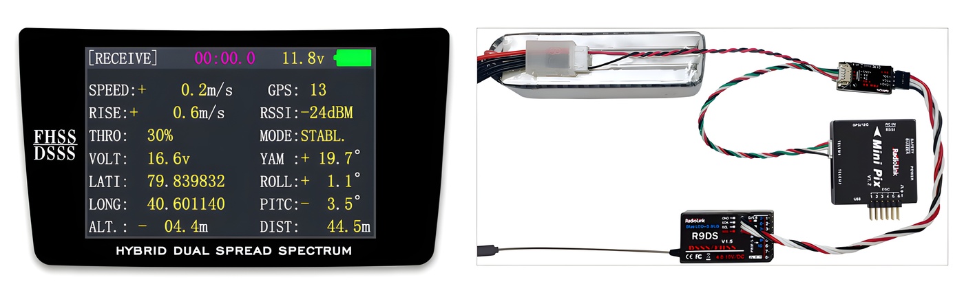 - Telemetry: model voltage, speed, climb, throttle, longitude, latitude, altitude, GPS, RSSI, flight mode, yaw, roll, pitch, and distance are displayed on the transmitter screen