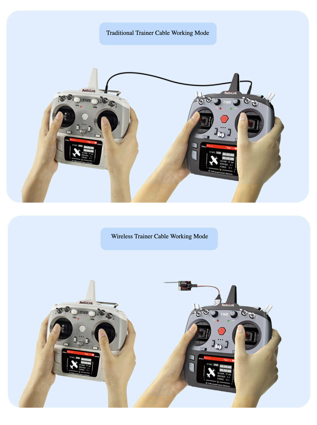 T16D/T12D has upgraded and optimized the original communication technology, improving the response speed and fault tolerance. The excellent compatibility and software expansion enable the receiver to communicate smoothly even if the trainee receiver stays close to the trainer transmitter, the communication technology is the key point to making the RadioLink wireless trainer function come true.