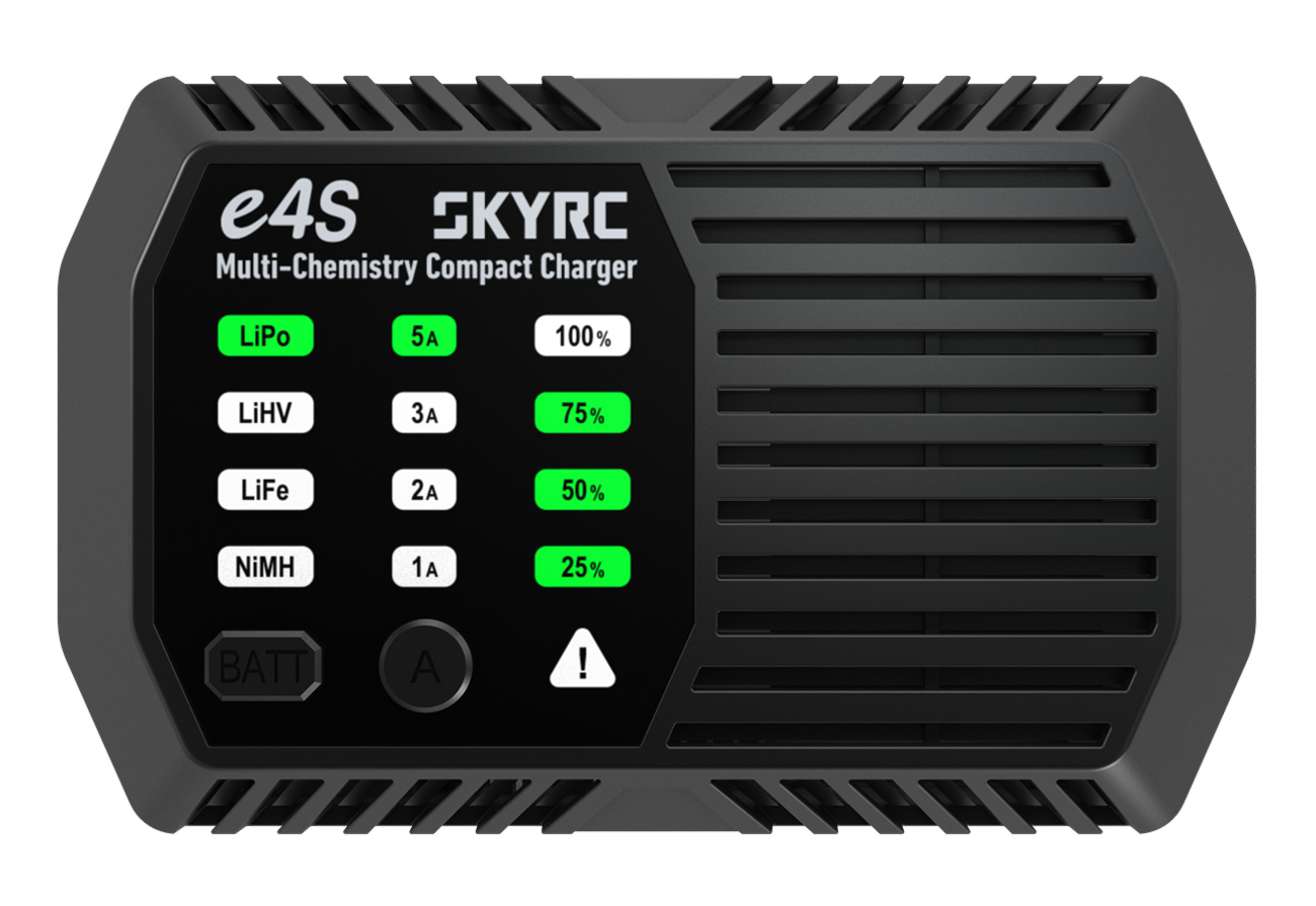 e4S - Multi-Chemistry Compact Charger - Stronger Current. Charge Ahead.The all-new e4S charger delivers up to 60 W of power and 5 A of charging current. Charge faster, more efficiently, and stay ready for every flight, every run, every race.