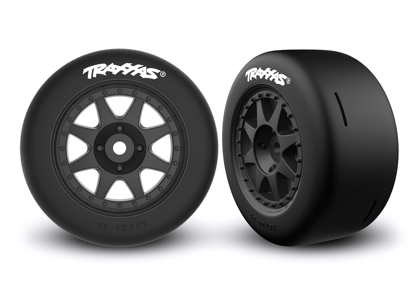 Traxxas 10876-BLK - Black Front Mini Rally Wheels w/ Slick Tires (Hard) (2)Mini Rally Speed Slick tires put maximum traction to the pavement for astonishing acceleration and cornering grip. Front Speed Slick tires are harder than the rear tires to maintain Rally's superior handling and balance. Tires come pre-glued and mounted to white 8-spoke Rally wheels.
