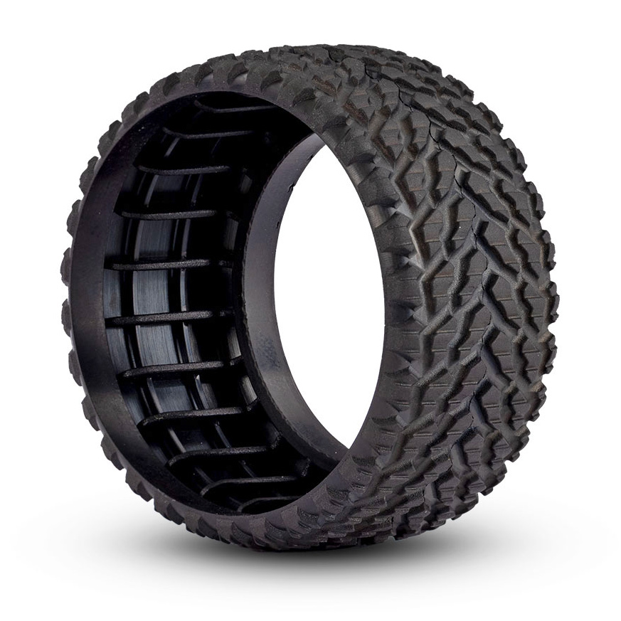 Mini Rally VXL wears new high-traction rally tires for outstanding grip on pavement and dirt. Internal reinforcing ribs replace conventional tire foams for more consistent and longer lasting tread support. Mounted to new 8-spoke rally-inspired wheels, the tires feature aggressive tread blocks for exceptional bite on loose surfaces.