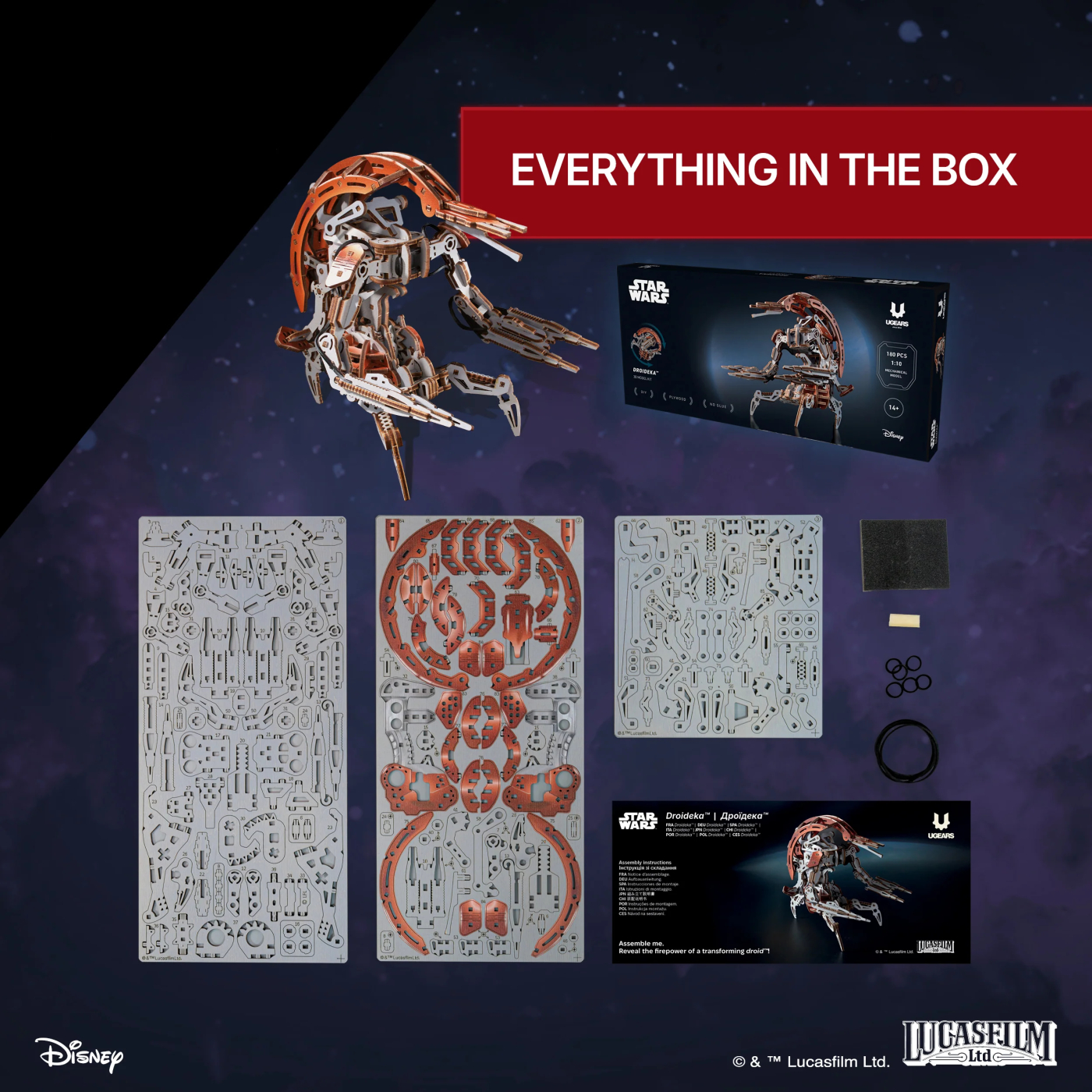 Droideka är ett mekaniskt 3D-pussel i trä från Ugears, inspirerat av de ikoniska förstörardroiderna från Star Wars™. Modellen återskapar droidens välkända förmåga att snabbt växla mellan kompakt rullform och fullt stridsläge, vilket gör den till både ett engagerande byggprojekt och en tydlig samlarmodell.