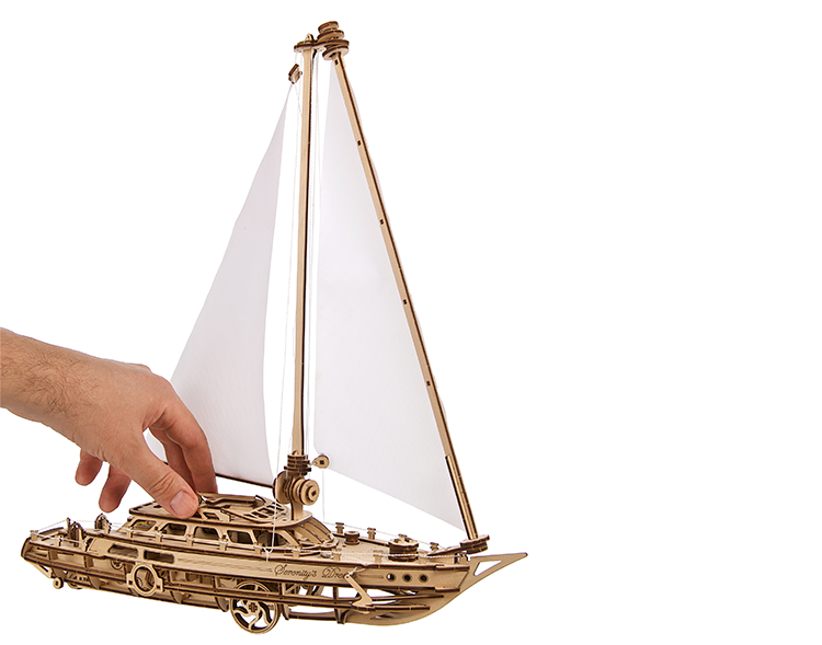 Sailors know the peaceful feeling of ocean sailing under a clear sky, a steady breeze filling the close-hauled white sails, as you skim the waves through a series of skillful tacks. It's that feeling of being one with nature and the elements, expertly beating to windward, feeling the boat pick up speed with the right sail trim. Invite a few friends along, maybe break out some wine and cheese in the evening—that's the dream, and you can live it with Serenity's Dream, the clever new mechanical yacht from Ugears.