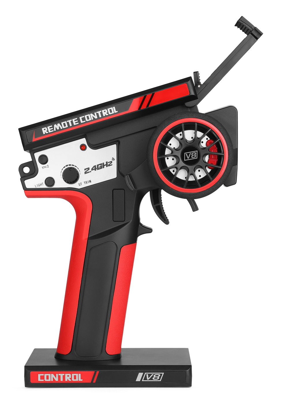 Det medföljande 2S 7,4V 350mAh LiPo-batteriet ger upp till cirka 60 minuters körtid i lågväxel och cirka 30 minuter i högväxel. Laddning sker via USB och tar ungefär 1 timme.