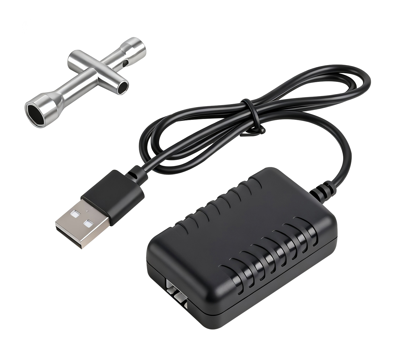 Medföljande 7,4V 400mAh LiPo-batteri ger en körtid på cirka 15 minuter beroende på körstil. Laddning sker via USB och tar ungefär 30 minuter.